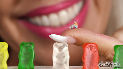 Custom Video Request - No Names Used: "You have a new tiny plaything who's just been shrunk and is waking up. You tell him that you're gonna play a little game with him to see if he gets to live. You place several (6 or so) gummy bears in a line on a table (or desk, counter, whichever) and tell him he's going to hide behind one of them while you pick one to eat. If he can avoid being chosen until the very end, you'll keep him as a tiny pet, but if he gets picked, you're going to eat him too. You close your eyes and countdown, waiting for him to pick a hiding spot. Then you choose one and eat it, hoping to find him behind it, teasing him as you go through all the gummies until there's only two left. Then you finally choose the one he's hiding behind, revealing that you knew he was there all along and that you don't play fair. You slowly eat the gummy he was behind, making him watch, and then finally swallow him too."